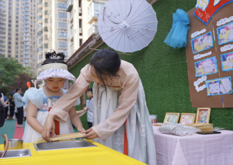 4.游园,接下来就来到了传统文化体验环节,请宝贝们拿着游园卡来一起体验造纸术,印刷术,扎染,糖画,投壶,古筝,书法,剪纸等,身临其境地感受传统文化的魅力。